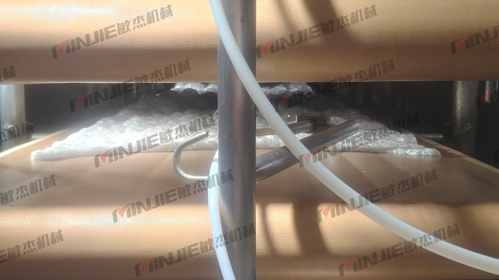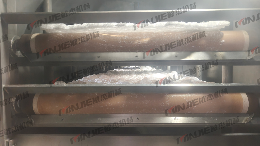 在上海敏杰的試驗(yàn)室內(nèi),山東公司的代表全程觀摩了試驗(yàn)過程。從高粘度的麥脂糖漿被均勻地涂布在鋼帶上,進(jìn)入真空干燥腔,到最終產(chǎn)出蓬松、干爽的固體泡沫帶,整個(gè)流程順暢、穩(wěn)定。