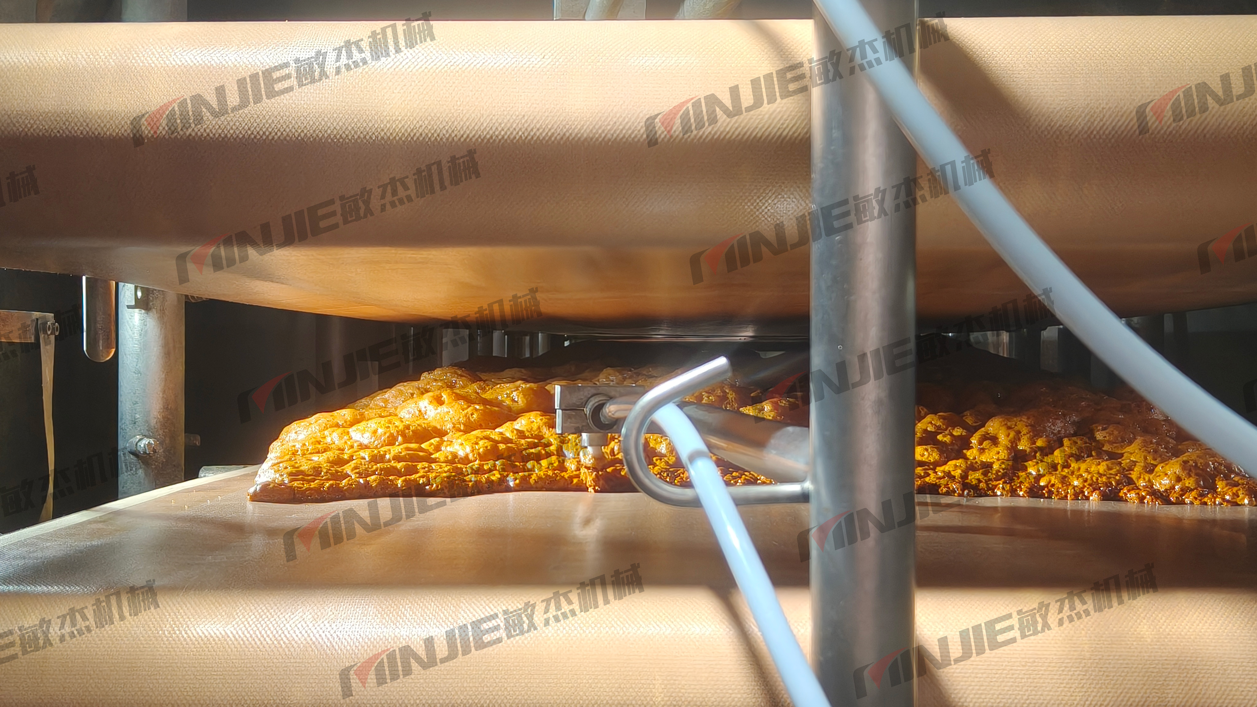 在試驗(yàn)現(xiàn)場,煙臺(tái)客戶的技術(shù)人員親眼見證了上海敏杰真空液體連續(xù)帶式干燥機(jī) 的工作全過程。粘稠的酵母提取物漿料通過進(jìn)料泵均勻地鋪設(shè)在干燥帶上,進(jìn)入真空干燥箱后,在設(shè)定的低溫下,物料迅速發(fā)泡、定型并干燥。最終,產(chǎn)出的酵母提取物干品色澤淺黃、質(zhì)地疏松、香氣純正。
